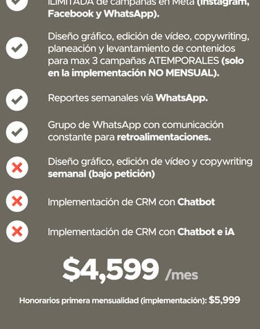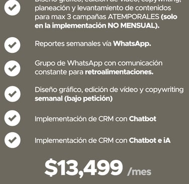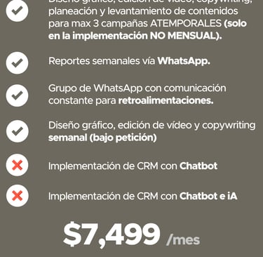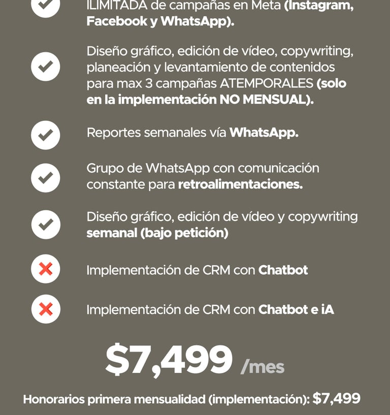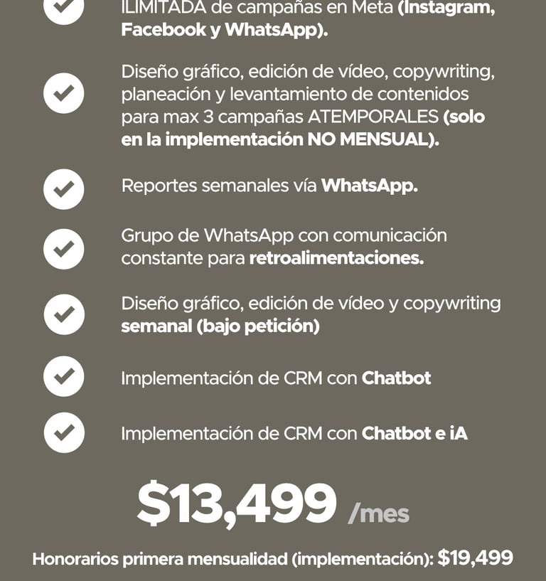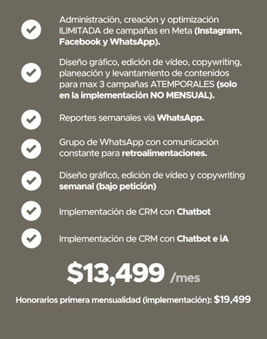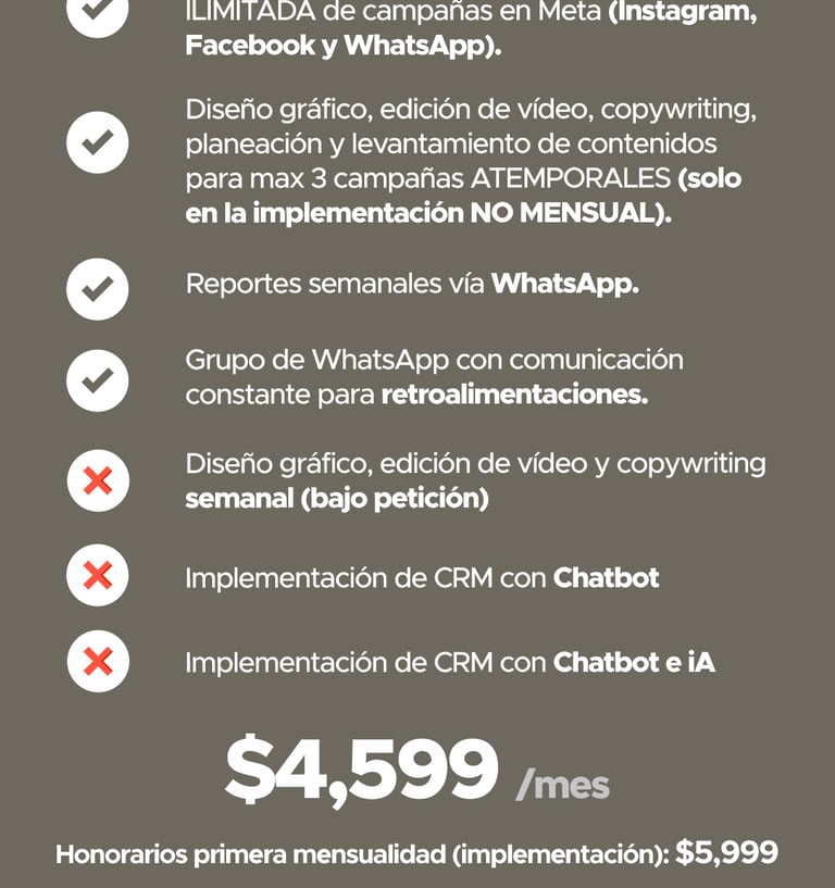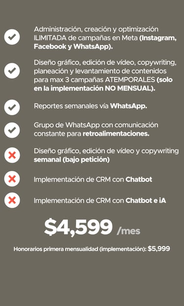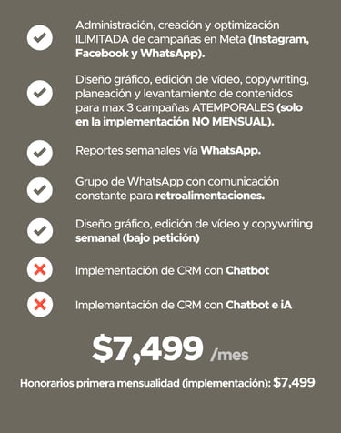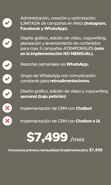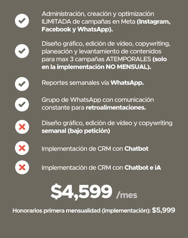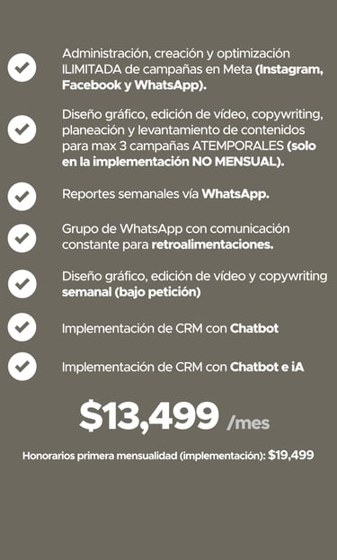 Tiempos de inicio e inicio de mensualidades: las campañas se activan entre 7 y 15 días naturales después de recibir el contenido base necesario para la creación de los anuncios. El cobro de la mensualidad comienza una vez que las campañas estén en circulación, según la tarifa previamente establecida.